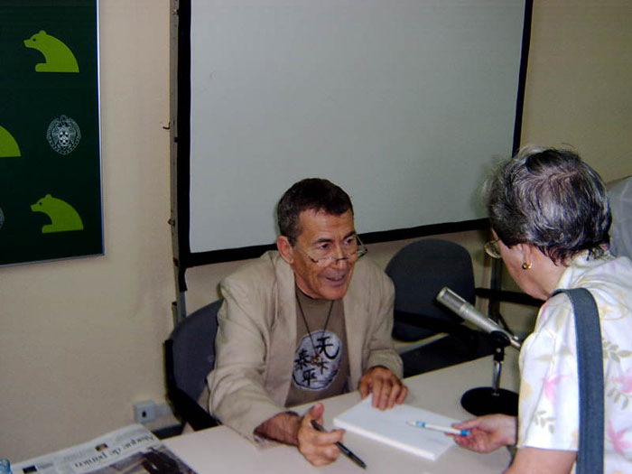 Al finalizar la conversación entre Fernando Sánchez Dragó y Ana María Matute, un aluvión de admiradores se abalanzaron sobre la mesa que ocupaba Dragó, ávidos de autógrafos, de firmas para libros, de fotografías con Dragó y de breves y apresuradas palabras intercambiadas con el admirado autor de sus libros de cabecera. Mucha gente le preguntaba cuál era el nombre de su página web, la cual había nombrado durante la conferencia, y también se acercaban a mí buscando información sobre sanchezdrago.com, incluso me tocó hacer una foto a una pareja de admiradores con Dragó, la vida de webmaster es lo que tiene...