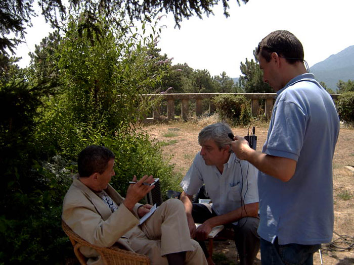 Fernando Sánchez Dragó, el director del reportaje y un técnico de sonido, que iba a colocarle a Dragó el micrófono de solapa |