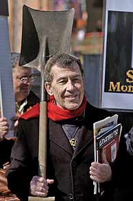 En la 'performance' participaron, entre otros, el escritor Fernando Sánchez Dragó, el profesor de la Universidad Carlos III Ilia Galán y el ensayista Javier Ruiz Portella, que enarbolaron picos y palas junto a las las obras del "cubo de Moneo" mientras exclamaban "Contra la banalización de las artes, transcendencia".