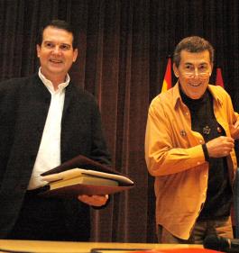 Fernando Sánchez Dragó y Carmen Calvo, ministra de Cultura, entregando sus respectivas donaciones |