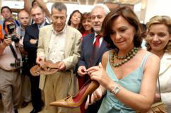 La ministra de Cultura, Carmen Calvo, quien abogó hoy en Elda por el calzado español como producto de 'belleza y moda', al margen de objeto de uso cotidiano, entregó hoy al escritor Fernando Sánchez Dragó el premio del concurso de trabajos periodísticos sobre zapato femenino 'Luis García Berlanga'.